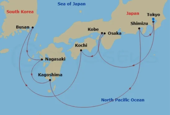 Visiting: Tokyo, Japan, Kobe, Japan, Kyoto (Osaka), Japan, Kochi, Japan, Busan, South Korea, Nagasaki, Japan, Kagoshima, Japan, Mt Fuji (Shimizu), Japan, Tokyo, Japan