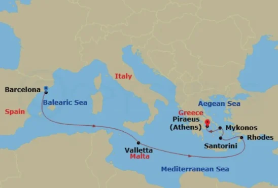 Visiting: Valletta, Malta, Rhodes, Greece, Santorini, Greece, Mykonos, Greece, Athens (Piraeus), Greece