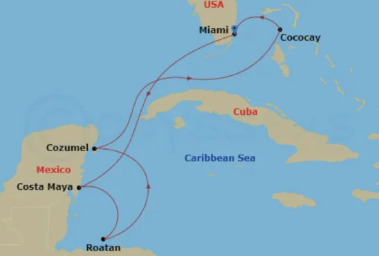 Visiting: Miami, Florida, Puerto Costa Maya, Mexico, Roatan, Honduras, Cozumel, Mexico & Perfect Day Cococay, Bahamas